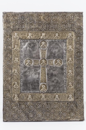 Piatto posteriore con al centro croce latina a sbalzo in argento dorato, decorata da racemi fitomorfici. Al centro e alle terminazioni dei bracci vi sono medaglioni circolari con figure a mezzo busto sbalzate: San Giovanni Crisostomo, San Gregorio teologo, San Nicola, il martire Menna e al centro San Basilio. La croce si staglia su un fondo d'argento liscio, circondato da una decorazione a tralci con piccoli fiori a sette petali. Attorno a questa composizione si trova un riquadro in argento dorato con diciotto medaglioni circolari che contengono altrettanti busti di santi guerrieri e martiri: il profeta Elia, Cosma, Damiano, Pantalemone, Mardario, Aussenzio, Eustazio, Eugenio, Oreste, Ciro, Giovanni, Ermolao, Cristoforo, Stefano il giovane, Poliuto, Areta, Giacomo persiano e Menna. Ai medaglioni si alternano racemi e girali fitomorfici. Il complesso è circondato a sua volta da una cornice in argento dorato, con una doratura però di colorazione meno intensa, costituita da una fila di girali fitomorfici, terminanti a foglia, che raddoppia nella parte superiore ed inferiore