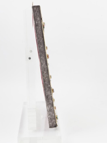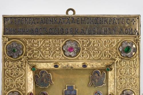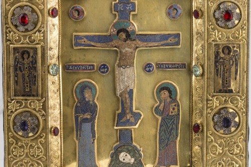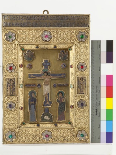 Icona rettangolare in argento dorato; al centro un riquadro in argento dorato a fondo liscio, con la scena della Crocefissione composta dalle figure rilevate a smalto cloisonné del Cristo in croce, con ai lati la Madonna e San Giovanni, due angeli agli angoli superiori e, al di sotto, due medaglioni circolari con le personificazioni del Sole e della Luna. Una cornice in argento dorato inquadra la placca; è costituita da un bordo interno decorato da un motivo a tralci fitomorfici con incastonate alcune pietre in vetro colorato, ed una larga fascia esterna con il medesimo decoro a tralci, raddoppiato, e con pietre in vetro colorato incastonate in elementi circolari che inscrivono un fiore sbalzato, profilati da un cordoncino a granuli. Tutti i bordi delle cornici sono profilati dal medesimo cordoncino a granuli. Due placchette rettangolari a smalto cloisonneé, rappresentanti due arcangeli a figura intera, sono posti al centro dei due lati lunghi. Nella parte superiore vi è una iscrizione a niello inclusa in una lastra rettangolare, anch'essa profilata dal cordoncino a granuli