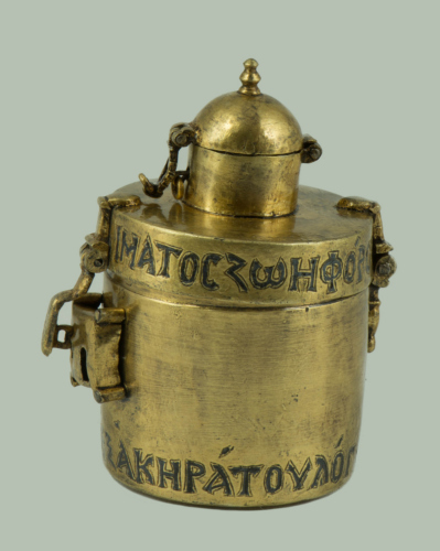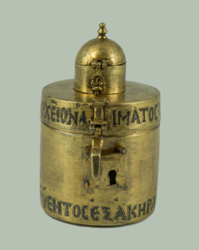 Scatola cilindrica in rame dorato, liscia, munita di serratura a lucchetto, con coperchio piatto. Nella parte superiore del coperchio vi è un altro elemento cilindrico di dimensioni inferiori, coperto da un coperchio a cupola, con piccola presa composta da due elementi ad anello schiacciato di dimensione digradante verso l'alto. Lungo il diametro del coperchio piatto e lungo il diametro inferiore della scatola vi è una iscrizione a niello