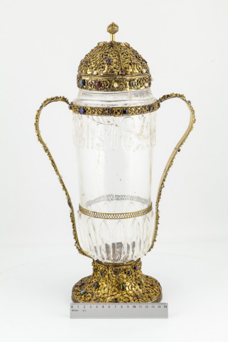 Vaso in cristallo di rocca composto inferiormente da una porzione a coppa, con motivo floreale astratto inciso, terminante a punta, e da una parte centrale cilindrica liscia; una fascia sovrastante riporta un'iscrizione intagliata; terminazione costituita da un basso elemento troncoconico liscio