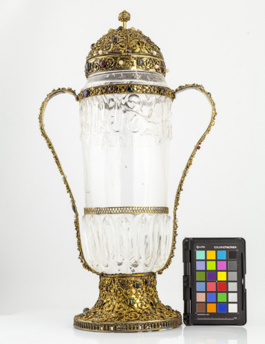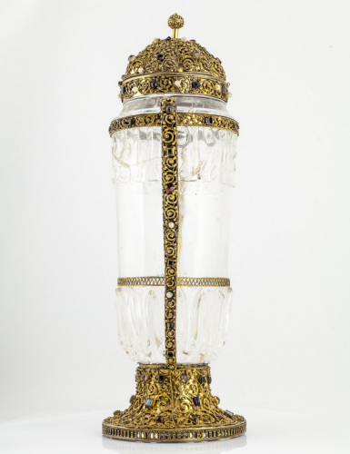 Vaso biansato con parte centrale in cristallo di rocca e montatura in argento dorato. Piede tronococonico svasato, decorato da volute in filigrana ornate di piccole foglie trilobate e fiorellini con piccola sfera centrale, suddivise in sei fasce da un profilo cordonato, con perle e pietre preziose rotonde e quadrate incastonate. Lungo la base è presente una fascia inferiore piatta, decorata ad arcate. Elemento centrale costituito da un vaso tubolare in cristallo di rocca, in parte decorato ad intaglio con iscrizione nella parte superiore. Copertura a cupola in argento dorato, decorata da spirali in filigrana suddivise in otto lobi, ornate da foglioline allungate e da fiori composti da piccole sfere, con perle e pietre preziose incastonate. Piccola presa sommitale costituita da un elemento cilindrico e da una terminazione sferica in filigrana. Due grandi anse simmetriche ad "S" si impostano nella parte terminale del piede, e si connettono ad una fascia in argento dorato posta superiormente all'iscrizione. Tutti questi elementi presentano la medesima decorazione a spirali in filigrana con perle e pietre incastonate. Una fascia in argento dorato a traforo con motivo a cordoncino serpentiforme corona la parte a intaglio collocata nella parte inferiore del vaso