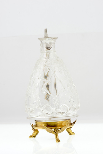 Brocca in cristallo di rocca con piccolo piede anulare e corpo piriforme. Il ventre è decorato a intaglio da due leoni, separati da una ornamentazione in arabesco, posti uno di fronte all'altro, seduti sulle gambe posteriori, con corpo decorato da piccoli cerchi e coda a riccio. Al di sopra corre un'iscrizione cufica. Imboccatura troncoconica con orlo estroflesso, con un listello nella parte inferiore. Ansa verticale a traforo con attacco inferiore all'impostazione del corpo e quello superiore sul collo; sulla curva si trova uno stambecco seduto