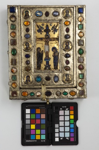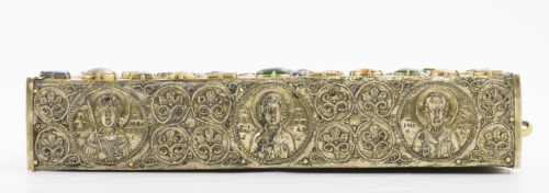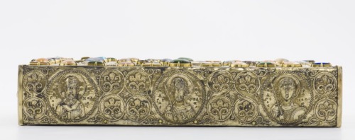 Scatola rettangolare in argento dorato con anima in legno, con chiusura costituita da una banda rettangolare collegata alla serratura e da una linguetta superiore in argento dorato, entrambe decorate da motivi a spirale doppia disposte a cuore. La parte superiore del contenitore, che è dotata di coperchio scorrevole, è decorata da elementi a smalto e pietre, mentre la parte retrostante è solamente in argento dorato, con una croce a sbalzo e motivi vegetali. I bordi laterali sono anch'essi in argento dorato, decorati da dieci medaglioni circolari a rilievo con i busti dei vescovi Gregorio, Giovanni Crisostomo, Basilio e Nicola da una parte, e i santi Eustazio, Procopio, Giorgio, Teodoro, Demetrio e Niceta dall'altra. Ai busti si alternano gruppi di quattro girali fitomorfici con terminazione a foglia. Al centro di uno dei lati corti vi è la serratura, inquadrata da un elemento quadrilobato con motivi vegetali incisi, nell'altro un elemento a doppio fiore sbalzato tra due medaglioni figurati. All'interno della cassetta vi è un altro pannello in argento dorato con una croce a doppia traversa a traforo, che custodisce i frammenti della Croce