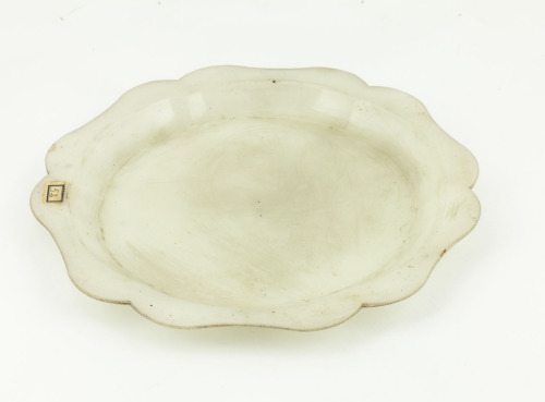Piatto in vetro bianco opaco, apodo con ampio fondo piatto; basso cavetto; bordo a tesa esagonale, a lati curvilinei con avvallamento centrale, divisi da intagli a punta