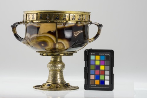 Una coppa più antica ad uso profano venne trasformata in un calice liturgico da una elegante montatura bizantina di X secolo. Non è certa l'epoca e l'ambito produttivo della coppa in sardonica, databile con riserva al I sec. a.C-I d.C.. Sulla parte esterna del fondo presenta una rosetta, non visibile poichè è coperta dalla montatura. L'iscrizione sotto la coppa si può riferire all'imperatore Romano I Lecapeno (920-940) ma anche a Romano II (959-963. Agli anellini erano appese ulteriori decorazioni pensili, andate perdute
