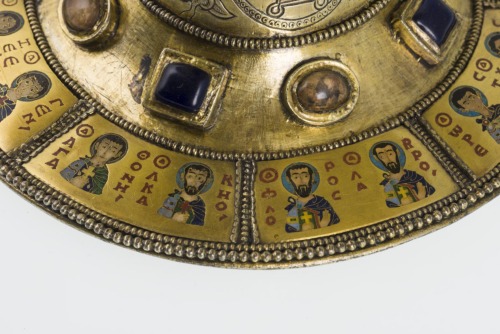 Base troncoconica svasata in argento dorato, con rigonfiamento anulare all'impostazione della coppa; lungo il diametro appiattito del piede vi è una fascia decorativa costituita da una linea di granuli, che raddoppia nel bordo inferiore, con al centro cinque placchette trapezoidali d'oro (tre sono mancanti), con due figure a smalto a mezzo busto: rispettivamente di Giorgio e Demetrio, Aussenzio ed Eugenio, Agatonico e Acacio, Floro e Lauro, Oreste e Cristoforo. Al di sopra corre una fascia dove vi sono delle incastonature quadrate e ovali alternate, con pietre blu e bianche, con al di sopra un'altra linea di granuli. La parte superiore della base e il nodo sono decorati a incisione e a niello da due fasce. Quella inferiore con cerchi puntinati, annodati tra loro, che inscrivono una croce greca a bracci patenti, con palmette angolari; quella superiore con palmette e fioroni entro cerchi puntinati uniti da anelli. Sotto la coppa vi è un'iscrizione a smalto blu. Coppa subcilindrica in sardonica con fondo concavo; è munita di due anse simmetriche, costituite da un doppio nastro divergente, unito al centro da una fascetta a modanature orizzontali, terminante nell'attacco superiore con un doppio elemento a tralci vegetali e motivo a goccia centrale con due spirali. Lungo l'orlo corre una fascia in argento dorato la cui decorazione ripete la scansione di quella del piede, con dodici placchette rettangolari (due mancano) con i busti policromi a smalto con coppie di Santi, profilate da granuli: rispettivamente Cristo e della Vergine, due Arcangeli, i santi Giacomo e Filippo, Caralampio e Cipriano, Basilio e Nicola, Antonio e Spiridione, Giovanni il Precursore e Giovanni Crisostomo, Niceforo e Lazzaro, Gregorio il Teologo e Gregorio il Traumaturgo, Pietro e Paolo, Bartolomeo e Simone. Alcuni piccoli anelli sono posizionati sotto le placchette lungo l'orlo