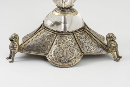 Base in argento dorato, poggiante su tre protomi leonine, composta da tre facce formate da due spicchi laterali a punta con un elemento lobato centrale. Il piede presenta una decorazione incisa suddivisa nelle parti componenti e profilata da una fila di granuli, dove, tra tralci fitomorfici, sono raffigurati due uccelli, affiancati nelle parti angolari da due galli e da quattro draghi con coda spiraliforme. Il fusto, poggiante su un cristallo semisferico, è formato da sette elementi in cristallo di rocca a poliedri con due registri di sfaccettaure e a cilindri a sei facce, alternati tra loro, di dimensione decrescente dal basso verso l'alto, montati su un'anima in rame e divisi da fascette in argento a doppie punte. Piattello espanso in argento dorato, composto da un elemento troncoconico in cristallo di rocca sottostante, e da un labbro piatto