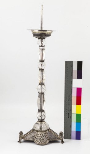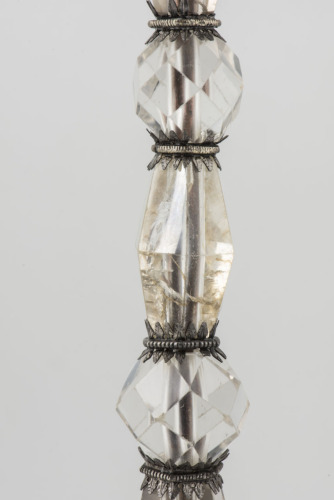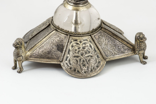 Base in argento dorato, poggiante su tre protomi leonine, composta da tre facce formate da due spicchi laterali a punta con un elemento lobato centrale. Il piede presenta una decorazione incisa suddivisa nelle parti componenti e profilata da una fila di granuli, dove, tra tralci fitomorfici, sono raffigurati due uccelli affrontati, affiancati nelle parti angolari da due pavoni, due leonesse e due uccelli. Il fusto, poggiante su un cristallo semisferico, è formato da sette elementi in cristallo di rocca a poliedri con due registri di sfaccettaure e a cilindri a sei facce, alternati tra loro, di dimensione decrescente dal basso verso l'alto, montati su un'anima in rame e divisi da fascette in argento a doppie punte. Piattello espanso in argento dorato, composto da un elemento a profilo sinuoso sottostante decorato nella parte inferiore da motivi a punte e in quella superiore da elementi a foglie, e da un labbro piatto