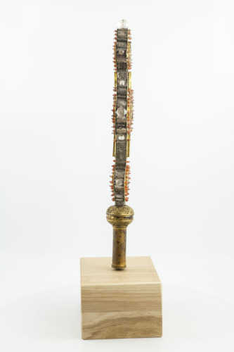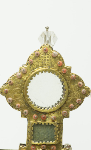 Alla base elemento sferico con doppio decoro a filigrana con motivi a foglia e fascia centrale liscia. All'incrocio dei bracci e alle estremità vi è un'apertura circolare coperta da un vetro, profilata da piccole sfere in corallo. I bracci presentano una terminazione quadrilobata, con decori cesellati a nastri intrecciati terminanti in foglie, nodi salomonici, forme geometriche intrecciate e grottesche; tre poliedri in cristallo sono fissati alle estremità. Lungo i bracci si collocano aperture rettangolari coperte da un vetro
