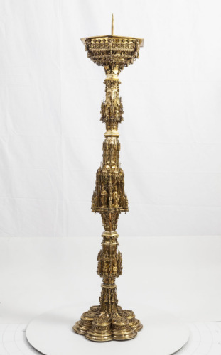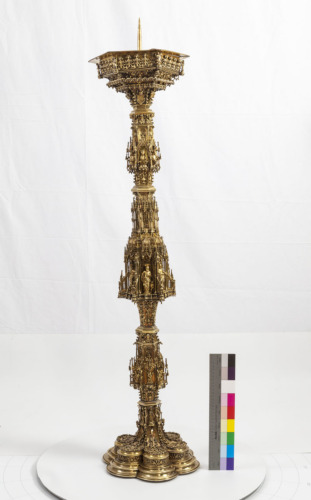 E' in coppia con un altro candeliere del tutto analogo, differente solo nel particolare del nodo superiore in cui vi è Cristo in croce al posto di una santa, e che la Trinità nel nodo più basso non ha la croce. La fascetta con animali fantastici sul piede è stata realizzata con il medesimo stampo del Reliquiario di S. Isidoro, conservato nel Santuario (Santuario 111). E' costituito da quattro parti avvitate tra loro