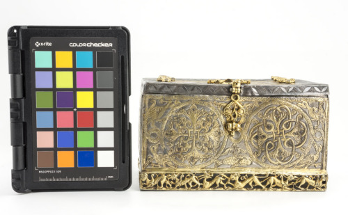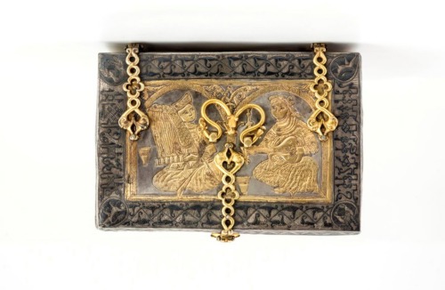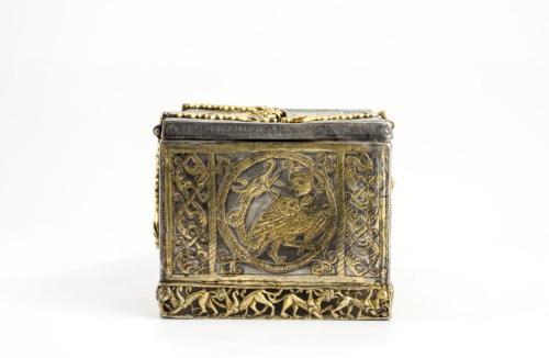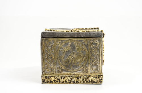 Scatola rettangolare in argento dorato. Coperchio piatto con superficie totalmente decorata: al centro sono rappresentati, entro due archetti, due personaggi seduti "alla turca", quello a sinistra con cappello a tamburo fasciato e casacca con ampi pantaloni, nell'atto di suonare un'arpa, quello a destra con un turbante fasciato e un ampio abito, nell'atto di suonare un liuto. Tra i due musicanti vi è un bicchiere troncoconico ed una bottiglia con doppio rigonfiamento anulare sul collo; un altro bicchiere si trova a lato del personaggio a sinistra. Il riquadro centrale è profilato da una fascia con decorazione niellata: sui lati lunghi vi è un motivo a doppio tralcio intrecciato con semipalmette, sui due lati brevi una pseudoiscrizione cufica; ai quattro angoli si trovano dei medaglioni a goccia con due quadrupedi rampanti e due coppie di uccelli. Sui fianchi, nei lati lunghi si trovano due medaglioni circolari, decorati a tralci punzonati, annodati tra loro, che contengono motivi cruciformi desinenti in duplice semipalmetta; nei quattro angoli vi sono quattro uccelli, e negli spazi tra i due cerchi in basso un pesce e in alto due semipalmette. Nei lati corti, entro due fasce laterali con doppio tralcio intrecciato di semipalmette, si trova un medaglione circolare con palmette ai quattro angoli, che inscrive un'arpia con corpo girato a destra e testa rivolta all'indietro, munita di coda serpentiforme terminante in una testa di drago con orecchie aguzze, corna ad U e fauci spalancate. La cassetta poggia su uno zoccolo lavorato a giorno con una serie di quadrupedi (sfingi, grifoni, lepri e leoni), sei sui lati lunghi e quattro su quelli brevi. E' munito di cerniere, maniglia e serrature costituite da elementi intrecciati a motivi geometrici, che terminano con teste di drago a fauci spalancate