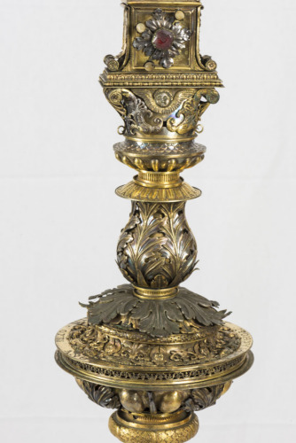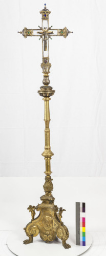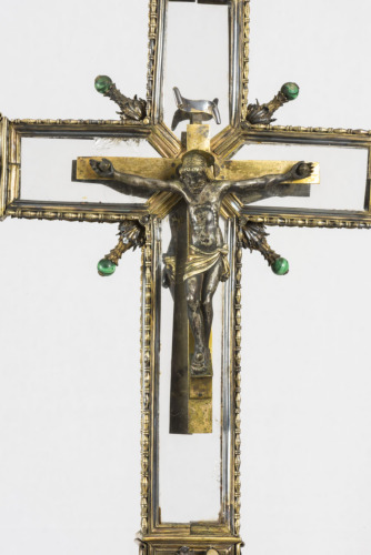 Basamento in rame e bronzo dorato, retto da piedini a zampe leonine in bronzo, sagomato a sezione triangolare con andamento leggermente concavo su ognuna delle facce, spartite in volute di ispirazione architettonica. Ogni faccia è decorata con bordure incise che contornano un ovale, entro il quale vi è il leone marciano. In basso lo spazio tra l'ovale e la cornice è riempito da fiori e da una testa di cherubino. Altri cherubini a tutto tondo si collocano a metà delle volute laterali. Nella parte superiore si imposta un elemento a sezione triangolare sagomato, con piccole volute e motivi geometrici; al di sopra si innesta un nodo a bocciolo con teste di cherubini. L'asta di sostegno è composta da parti di argento dorato liscio, interrotte da anelli torniti e da un nodo bacellato. Croce latina in cristallo di rocca con montatura a sottili profilature d'argento. Bracci ad estremità quadrate con ornamenti a foglie d'argento, quattro perle e una pasta vitrea colorata al centro. Due piccole volute alle estremità dei bracci laterali e di quello superiore le congiungono ad un listello perlinato su cui poggiano cuscinetti a squame, con bottone a foglie d'acanto che regge una sfera in smalto blu alle estremità. Gli stessi bottoni, con sfere in malachite, sono posti diagonalmente agli incroci dei bracci. Sul davanti e sul retro è applicata una croce d'argento con il Crocefisso. Il braccio inferiore della croce è sorretto da un capitello con teste di cherubini e da una serie di elementi modanati e ad anello decorati; su uno di essi si trova un'iscrizione