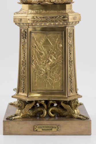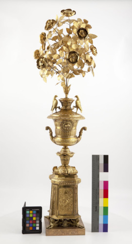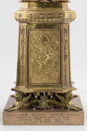 Zoccolo quadrangolare liscio dorato, con iscrizioni incise nella parte frontale e nella parte posteriore. Basamento ad alto parallelepipedo in bronzo dorato, con angoli smussati, ornato sulle quattro facce da rilievi a sbalzo con oggetti liturgici disposti a panoplie, retto da quattro mostri leonini alati con coda serpentiforme. Vaso in bronzo dorato, sagomato ad anfora, decorato con motivi classicheggianti che coprono tutta la superficie, con al centro lo stemma del Papa entro un cerchio; è munito di due anse ricurve, che si impostano nella parte inferiore, terminanti a teste leonine. E' raccordato al mazzo di rose da un elemento biconico, decorato a motivi vegetali, affiancato da due colombe affrontate, con una zampa appoggiata ad elementi a foglia aggettanti. Mazzo composto da tredici rose in oro, di cui quella in cima più grande e con teca interna e piccolo coperchio forato