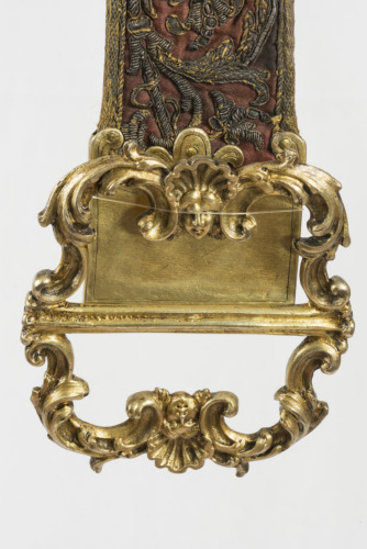 Cintura in broccato ornata a filo d'oro con girali fitomorfici fioriti. Alle due estremità vi è una fibbia in argento: una con lo stemma papale e l'altra costituita da due lementi speculari con due mascheroni centrali tra una cornice di tralci a foglie, collegati da una traversa orizzontale