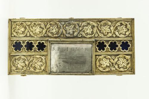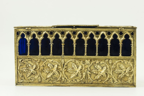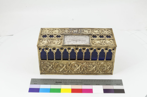 Scatola rettangolare in argento dorato con anima in legno e coperchio piatto. Sul coperchio vi sono tre fasce decorative parallele, entro bordi perlinati, due con doppi girali fitomorfici terminanti a foglie ed una centrale con medaglioni esalobati. Al centro un'iscrizione entro una lastra rettangolare liscia interrompe le prime due fasce. Sui fianchi la decorazione si distribuisce su due registri entro bordi perlinati, uno inferiore con i medesimi girali fitomorfici presenti sul coperchio, quello superiore con arcate trilobate gotiche rette da colonne tortili, con medaglioni esalobati nella parte superiore. Le arcate dei tre lati anteriori sono state ritagliate e attualmente vi sono delle lastre in vetro blu