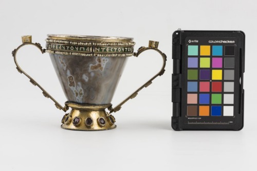 Base troncoconica in argento dorato, profilata da linee di granuli, con pietre incastonate di forma ovale. Coppa troncoconica liscia in sardonica, con interno bugnato. Orlo decorato da montatura in argento dorato con iscrizione a smalto bianco su fondo verde, distribuita su quattro placchette, compresa entro due file di perle profilate da linee di granuli. Munita di due anse piatte, impostate alla base della coppa e sulla parte inferiore della fascia lungo l'orlo, decorate da cabochons e da file di granuli