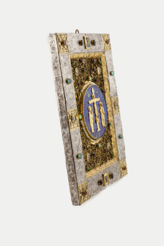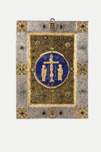 Icona rettangolare composta da un medaglione centrale circolare in lapislazzuli, con la rappresentazione della Crocefissione in oro al centro, profilato da una linea di piccoli elementi semicircolari, con tratti paralleli verticali incisi, e da una fila di piccole perle. Il medaglione è inquadrato da quattro pannelli in filigrana di argento dorato ornati da motivi a spirale e volute, con pietre preziose incastonate di diversa forma. In ognuno dei pannelli vi è al centro una placchetta circolare in oro a smalto, che rappresenta a mezzo busto rispettivamente l'Arcangelo Raffaele, San Matteo, Sant'Andrea e San Giovanni evangelista. Questa composizione è circondata da due cornici rettangolari, una interna con motivi a girale fitomorfico, ed una esterna, più ampia, costituita da rettangoli in argento alternati a quadrati in argento dorato, con al centro pietre ovali verdi e rosse in vetro. Al centro di ognuno dei lati sono inserite quattro placchette a smalto, due rettangolari sui lati corti entro i quadrati dorati, e due circolari sui lati lunghi, entro i rettangoli argentati, con due pietre in vetro ai lati. Queste placchette rappresentano a mezzo busto San Cosma, San Matteo per due volte, ed un altro santo non identificabile