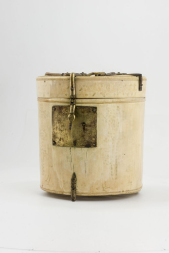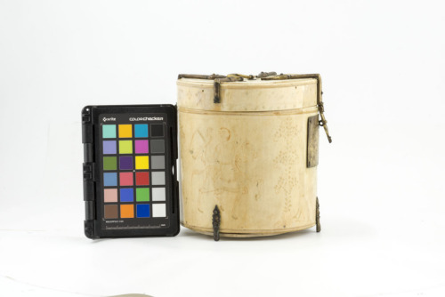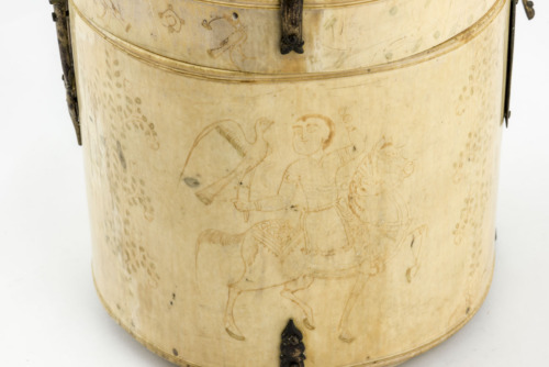 Pisside cilindrica in avorio con coperchio piatto; munita di piedini metallici di sostegno, fissati nella parte inferiore del corpo. Sul coperchio vi è un manico centrale metallico e quattro borchie allungate a terminazione lanceolata. E' dipinta con un soggetto comprendente due cavalieri tra due alberi, che reggono un falco nella mano destra. Sotto la base vi sono due gruppi di uccelli che si toccano il becco. Sul bordo esterno del coperchio si trovano due uccelli affrontati, con ramoscello nel becco, ed un'iscrizione in caratteri "nashki" oggi quasi del tutto scomparsa. La parte superiore del coperchio è ornata da quattro medaglioni circolari dipinti, due con pavoni di profilo e due con arabeschi
