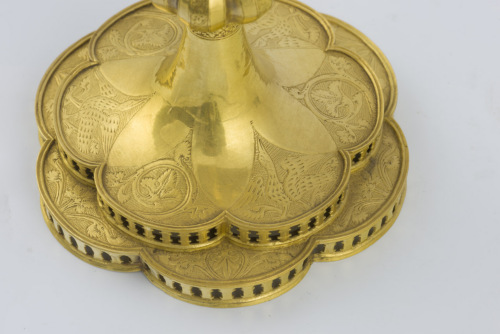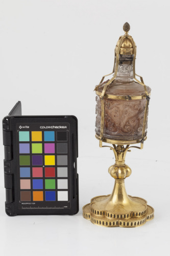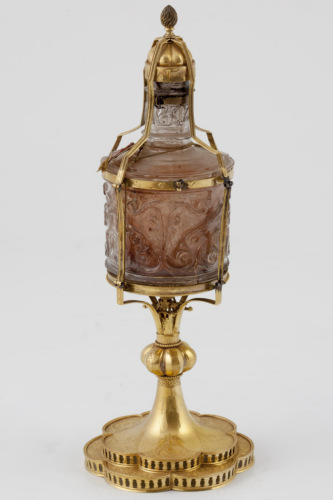 Vaso in cristallo di rocca con piede ad anello, corpo cilindrico, spalla obliqua e collo cilindrico. Il corpo è decorato da arabeschi in forma di palmette e tralci ripetuti, delimitati da modanature con profilo appuntito poste lungo il diametro superiore e inferiore del corpo, che si ripetono anche lungo il collo. Al centro di quest'ultimo corre un'iscrizione