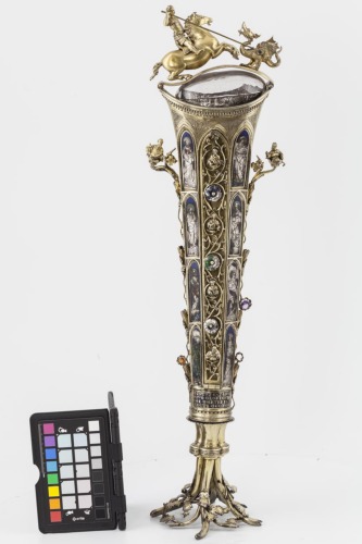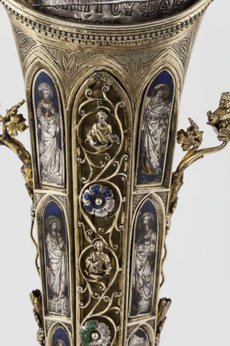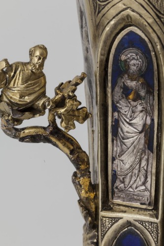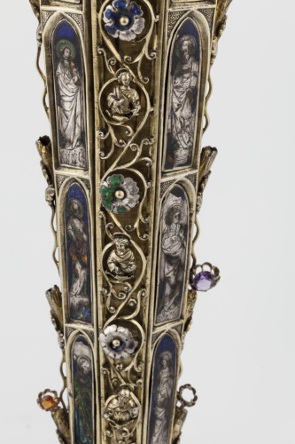 Basamento costituito da grossi steli che si allargano verso il basso, ornati di foglie appuntite. Fusto quadrilobato con piatto nodo quadrilobato ornato di stelle. Reliquiario troncoconico a sezione ovale, che si imposta su un elemento ad anello con un'iscrizione sui due lati. Il corpo del reliquiario è diviso verticalmente su ogni faccia in tre settori. Nella fascia centrale si trovano busti di santi alternati a girali fioriti a rilievo; ai due lati, in una serie di aperture ad arco acuto, si inseriscono placche a smalto con figure di santi. Dagli spigoli tra le due facce partivano otto tralci di foglie, che reggevano alle estremità altrettanti busti, di cui restano solo i due superiori, mentre gli altri sono sostituiti da ametiste e fiori. Alla sommità una copertura in vetro copre la reliquia; su una barretta ricurva vi è un gruppo a tutto tondo che rappresenta San Giorgio che combatte con il drago. All'interno è conservata la reliquia, rivestita da una lamina d'argento dorato, con un'iscrizione in greco incisa nella parte superiore