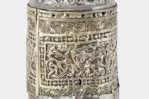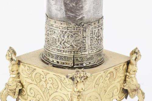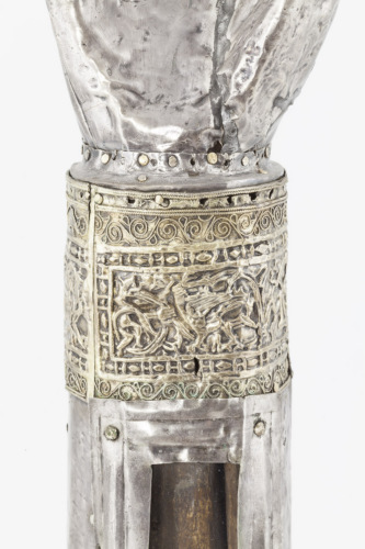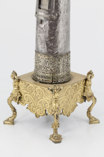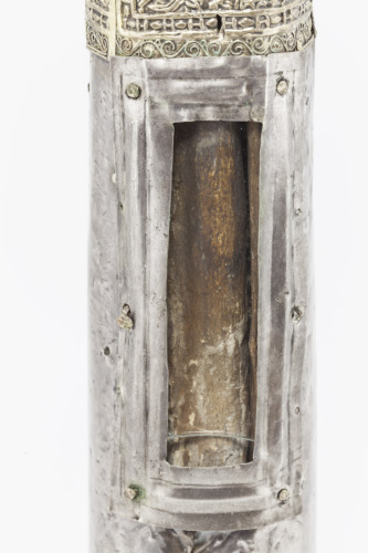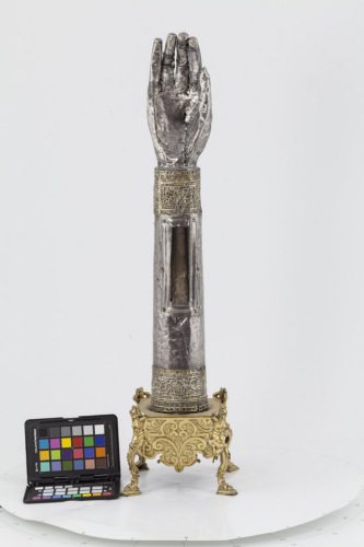 Reliquiario con base quadrangolare in bronzo dorato, retta da quattro sostegni costituiti da cariatidi con braccia piegate dietro la testa, posizionate ai quattro angoli, e con bordi laterali decorati a volute. Cilindro in legno rivestito d'argento, liscio, rifinito da estremità dorate ornate a filigrana e a stampo da profili costituiti da un nastro a volute, che includono delle raffigurazioni in cui si riconoscono due figure nude, un drago volante, un leone e un uccello. Nella parte centrale è stata ricavata una finestrella rettangolare. A coronamento mano destra aperta in argento a tutto tondo, priva dell'anima in legno