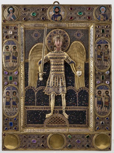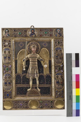 Icona rettangolare in argento dorato su anima in legno; al centro si trova un riquadro con l'arcangelo Michele a rilievo, a figura intera, con spada con pomello costituito da una perla nella mano destra e globo sormontato da croce con piccoli rubini nella sinistra; entrambi gli elementi sono a tutto tondo. La figura dell'arcangelo, rappresentato con una corazza, è interamente decorata (unica eccezione le calzature) da smalti multicolori cloisonnés; una perla è fissata tra i capelli. Ha un nimbo decorato da motivi circolari in oro che contornano e sono contornati da elementi fitomorfici e geometrizzanti. Le ali in argento dorato sono invece prive di smalti. Lo sfondo è totalmente coperto da smalti cloisonnés multicolori, suddivisi in fasce. Quella superiore è costituita da piccoli cerchi sovrapposti bianchi, che includono una sorta di quadrifogli, su fondo azzurro; vi sono anche due cartigli quadrilobati con una iscrizione. Quella inferiore rappresenta un giardino del Paradiso stilizzato, composto da motivi vegetali su sfondo blu, suddiviso in tre registri di cui quello centrale è scandito da quattro archi a tutto sesto. La raffigurazione è contornata da una cornice composta di placchette con motivo a smalto a treccia a due capi entro i quali si trovano dei rosoni. Una cornice più ampia inquadra il tutto; anch'essa è interamente decorata da smalti multicolori cloisonnés e da gruppi di cinque pietre preziose di diverso colore. Nei lati corti sono incastonati medaglioni circolari; nella parte superiore si trovano quelli del Cristo al centro tra San Menna e San Pietro, rappresentati a mezzo busto. Nei lati lunghi vi sono quattro medaglioni ovali con coppie di santi guerrieri a figura intera: a sinistra i due Teodori e Demetrio con Nestore, a destra Procopio con Giorgio e Eustachio con Mercurio