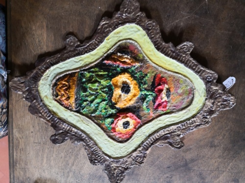 cartone coperto su un lato di cartapesta modellata, dipinta e verniciata