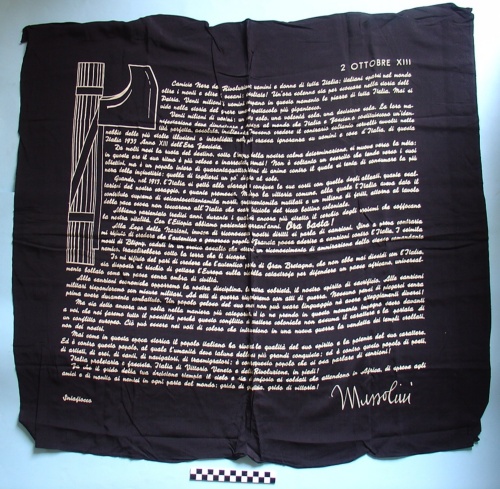 fazzoletto in tela nera stampato con scritte in bianco. In alto a sinistra l'angolo è ornato da un disegno di fascio littorio con scure verso destra.