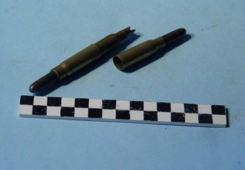 cartuccia 8mm di Mannlicher con fondello segato in cui è stata inserita una cartuccia 6,5mm Carcano senza palla al posto della quale è stato fissato un beccuccio per l'inserimento del pennino; alla base del proiettile Mannlicher incastrato un anello che funge da fermo per il cappuccio ottenuto da una ulteriore cartuccia 8mm Mannlicher.
