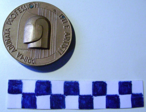 Di forma circolare. Sul recto, al centro, in rilievo testa stilizzata a sinistra del Duce sovrapposta a profilo di un fascio littorio. Iscrizioni lungo la corona e sotto la figura a sinistra. Sul verso, al centro, in rilievo, mano tesa in verticale a salutare romanamente sotto stella a cinque punte. Iscrizione lungo la corona.