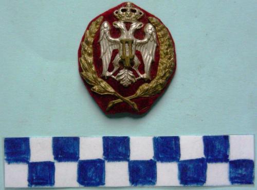 Di forma ovale. Rami di quercia ed alloro dorati ed incrociati a racchiudere aquila bicipite coronata, argentata con sul petto un simbolo non identificabile, il tutto su panno rosso. Sul verso due spilli di fissaggio.