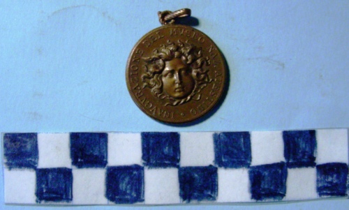 Di forma circolare. Sul recto, al centro, in rilievo, la testa della Medusa di fronte. Iscrizione lungo la corona. Sul verso, al centro, in rilievo, gli stemmi coronati ed affiancati della città di Este e del CTI Iscrizione lungo la corona. Anello all'appiccagnolo.