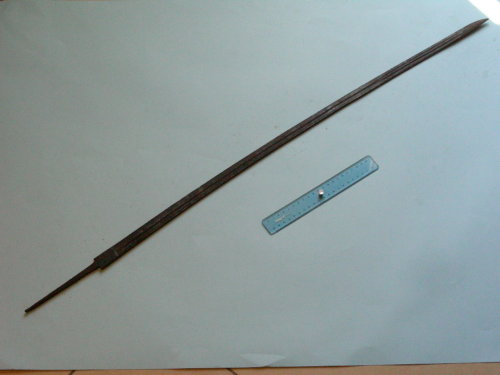 Leggermente curva, con incisioni ad acido a motivi militari e floreali fino a metà; punta al dorso. Sguscio su entrambi i lati fino al debole; doppio sguscio per l'ultimo quarto. Conserva il codolo e la filettatura per il bottone.