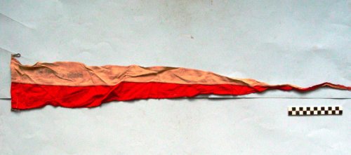 due triangoli rettangoli di colore bianco e rosso cuciti a fornare un triangolo isoscele. Alla base è inserita una corda con ad ogni capo un moschettone di fissaggio all'asta.