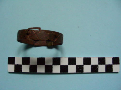 Di forma circolare, in due pezzi incernierati e snodati, aggancio a forma di cintura con fibbia, terminante con forma di mano destra umana chiusa con indice proteso e passante. Decorazioni a forma di losanga su tutta la circonferenza.