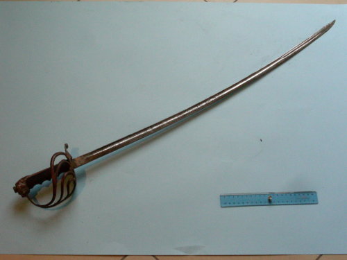 Lama curva, a filo, punta e controfilo; ampie sgusciature sui due lati per i primi tre quarti; per l'ultimo quarto sgusciatura doppia; punta al dorso, un pò ribassata. Incisioni ad acido fino a metà lama con motivi militari e floreali. Fornimento con guardia e tre elsi terminanti a riccio all'estremità, salenti a congiungersi al ramo principale di guardia; il ramo più lungo si sdoppia. Piatto di guardia con conchiglia per il pollice; corto ramo di parata terminante a riccio scanalato. Cappetta lunga che termina superiormente a testa di leone con criniera corta. Bottone ovale, piatto, avvitato al codolo. Impugnatura anatomica.