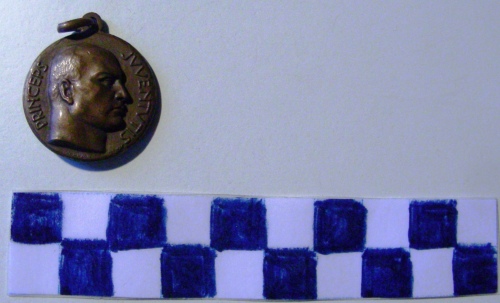 Di forma circolare. Sul recto, al centro, in rilievo busto accollato a destra di Mussolini. Iscrizioni lungo la corona e sotto la figura. Sul verso, al centro, in rilievo, tre fasci littori affiancati e mano tesa, nell'atto di salutare romanamente a sinistra. Iscrizioni lungo la corona e sotto la figura. Anello all'appiccagnolo.
