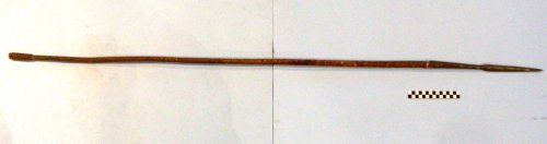 lama a forma di fuso allungato; punta a sezione a losanga con nervatura centrale a tutta lama. Asta originale. Puntale composto da lamina avvolta sull'asta.