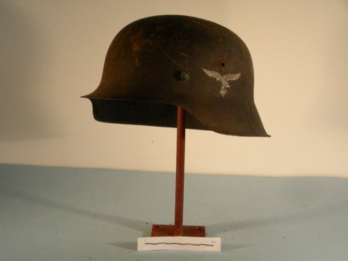 Calotta estroflessa con due fori di aerazione e tre rivetti di fissaggio del cerchio che sosteneva l'imbottitura interna. Visiera pronunciata.