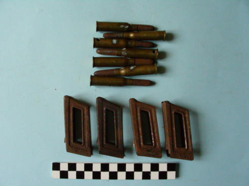 Bossolo di forma cilindrica, con fondello e restringimento all'apice; proiettile conico con punta arrotondata. Le sette cartucce conservano una piastrina con bande laterali.