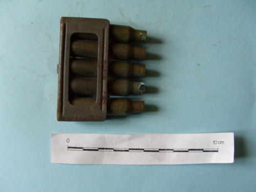 Struttura in lamiera stagnata a parallelepipedo aperto, contenente 5 bossoli di calibro 6,5 con fondello e restringimento all'apice