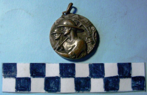 Di forma circolare. Sul recto, al centro, in rilievo, busti a sinistra di due operai con casco coloniale, piccone, pala e macchina schiacciasassi a destra, sullo sfondo. Iscrizione a sinistra lungo la corona. Sul verso, al centro, in rilievo un fascio littorio con scure in basso su aquila rivoltata ed abbassata. Iscrizioni a destra del fascio littorio e sotto la figura.