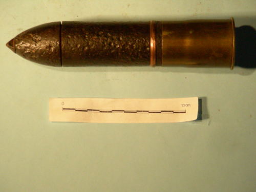 A forma cilindrica, conserva ogiva, corona di forzamento liscia e bossolo.