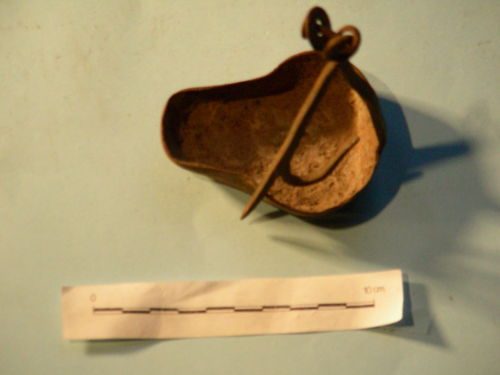 Piatto a goccia con bordo rialzato. Gancio di sostegno con punta ad arpione collegato mediante snodo al braccio ricurvo del piatto.