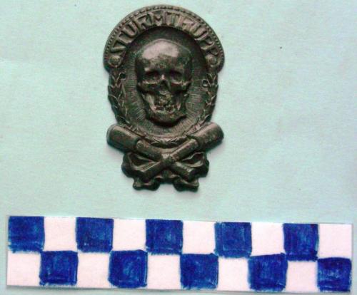 Di forma ovale. Iscrizione sulla corona nella parte superiore. Al centro in rilievo, circondato da serto d'alloro un teschio e sottostanti due bombe a mano con i manici incrociati. Ai lati due fori per il fissaggio.
