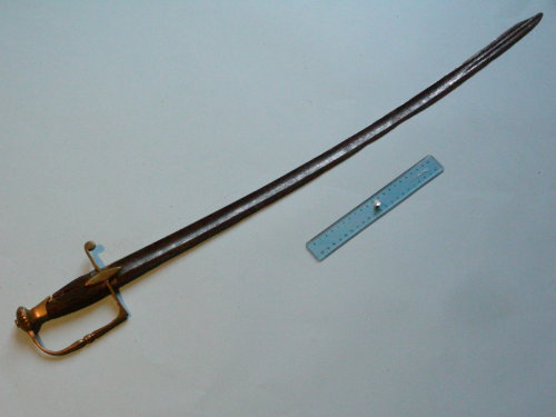 standard militare. Lama curva, a un filo, punta e controfilo; ampie sgusciature sui due lati per i primi tre quarti; per l'ultimo quarto due sgusci al centro per la lunghezza del controfilo. Punta ribassata alla pandura. Guardia a staffa ad un solo ramo; ramo di parata a riccio. Alette fermafodero romboidali. Cappetta senza dorso. Tipico pomello a forma di fiore. Bottone circolare avvitato al codolo. Impugnatura di forma squadrata, zigrinata ai lati.