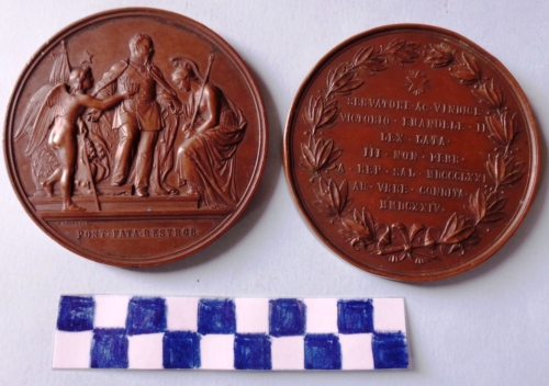 Di forma circolare. Sul recto al centro, in rilievo, il re in piedi di fronte, con divisa e mantello, con a destra figura allegorica femminile rappresentante Roma con capo inchinato e a sinistra figura allegorica rappresentante un angelo, sormontato da stella a cinque punte, nell'atto di porgere la corona al re. In secondo piano leoni stilizzati. Iscrizioni in esergo. Sul verso, al centro, in rilievo, iscrizione entro rami d'alloro legati da nastro e sotto stella a cinque punte raggiante.