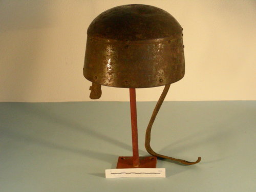 Calotta ovoidale fissata con chiodini ribattuti alla falde anteriore e posteriore. Sottogola attaccato mediante ribattini a supporto in lamiera.