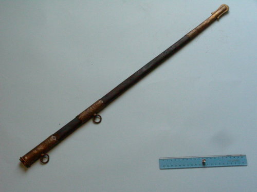 in lamierino rivestito di cuoio nero. Il puntale, la fascetta e la cappa sono in bronzo dorato con incisioni al cesello a motivi floreali. Due campanelle, una sulla fascetta e l'altra sulla cappa. Cappa montata al contrario. Puntale crestato.