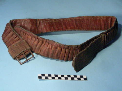 Cinturone terminante con una fibbia e passante a sinistra ed un doppio cinturino sovrapposto a destra applicato ad un terzo della lunghezza a coprire parte degli alloggiamenti dei proiettili. Sul cinturone sono cuciti 67 alloggiamenti per cartuccia decorati a motivi geometrici. Il passante ed il cinturino superiore sono decorati con disegni floreali.